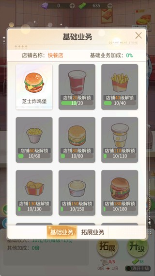 1、随着等级与资金积累,逐步解锁商业街中的生鲜超市、幸福便利店、服装店等新店铺,避免单一店铺经营,分散风险的同时拓展营收渠道。