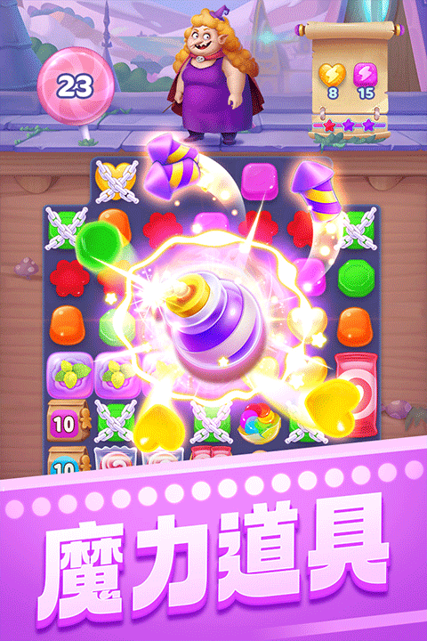 三个女巫一台戏,要么射出几个小怪兽,要么赐予几颗硬糖,要么冰冻某些糖果…总之,她们会想尽一切办法,不让你安宁,唯一的办法就是你必须尽 快的消灭她们。