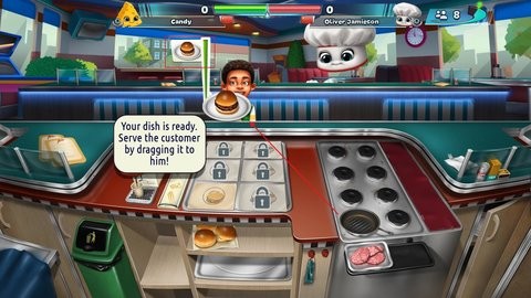 4、根据顾客要求,制作食物和饮料,完成烹饪后将食物拖至顾客自动完成订单。