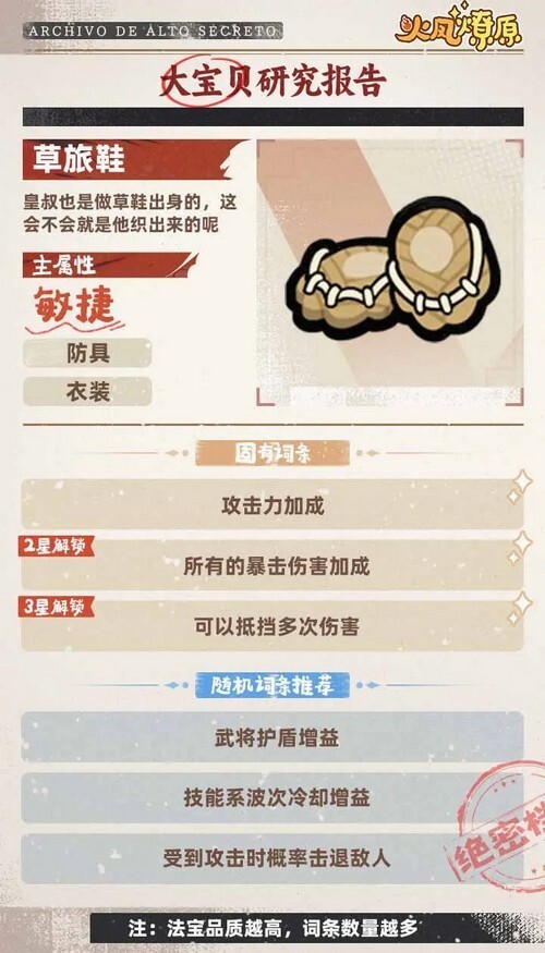 草鞋作为一种防具,其固有词条的属性都颇为不错,很适合敏捷型武将使用。而随机词条方面,玩家能够依据自身的实际需求,自行进行搭配。