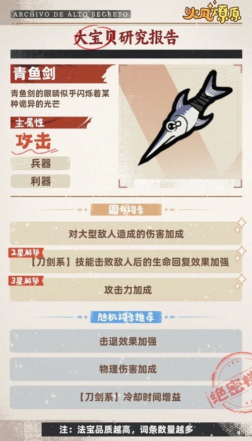 刀剑类法宝,适合像张辽、孟坦这类擅长刀剑的武将。其推荐词条与偃月刀差别不大,一旦获取便能使用。