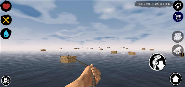 1、开局时用钩子收集资源,注意不要漏木桶,勾不到就下水捞,先造杯子和煮水器,然后造炉子和鱼竿;