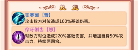 技能分为3种:普通技能(普通技能为每回合自动释放)、怒气技能(积攒满怒气之后可手动释放怒气技能)、天赋技能(卡牌进阶之后可获得天赋被动技能)。