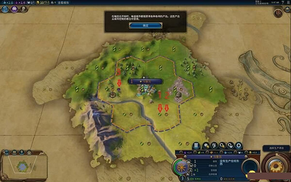 3、如图所示,1号绿叶图标表示每回合增加食物,2号图标代表工业,3号图标表示文化。