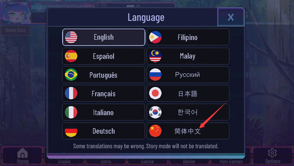 1、在本站下载安装加查艺术,运行游戏,选择右下角的“language”;