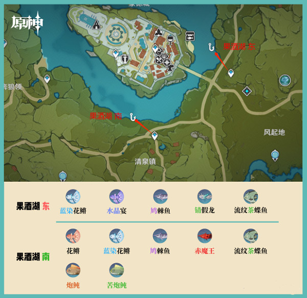 果酒湖南面的鱼类有:花鱂、蓝染花鱂、鸠棘鱼、赤魔王、流纹茶蝶鱼、炮鲀、苦炮鲀。(钓鱼位置见下图)