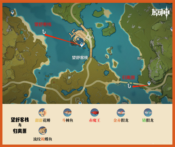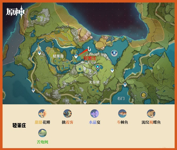 璃月共有七个钓鱼地点,分别是:轻策庄、望舒客栈、归离原、奥藏山、琥牢山、渌华池、天遒谷。