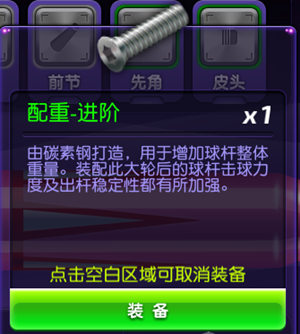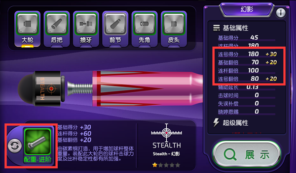 点击进入球杆部件展示界面。可以更新的部件会有金色高亮边框提示,下面的更新按钮也会有特效提醒。