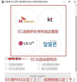 4、点击手机验证后会弹出新的窗口,需要我们选择自己的手机运营商,同意条款,然后选择认证方式。PASS 认证需要下载APP比较麻烦,这里推荐使用短信认证,就是下面的选项。