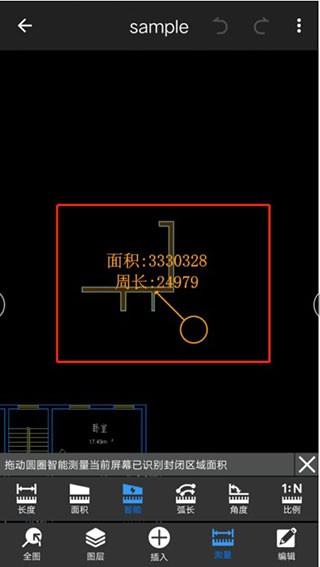1、在本站下载安装CAD迷你看图app打开,进入app打开一个CAD文件,两指捏合触摸放大图纸到需要测量的地方