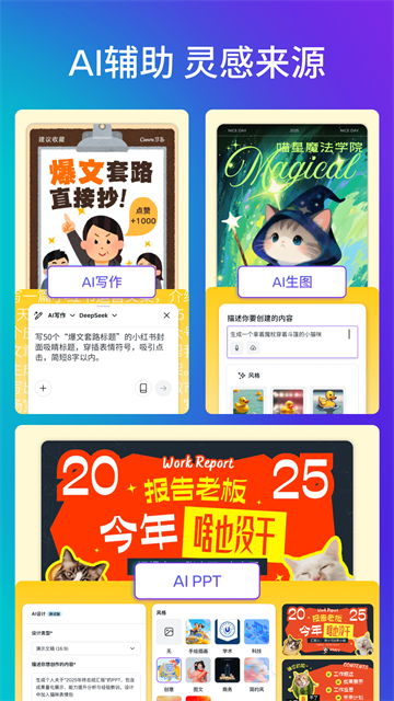 4、引入AI技术,如魔力快写、魔力素材生成器等,帮助用户快速生成文案、图片等内容。