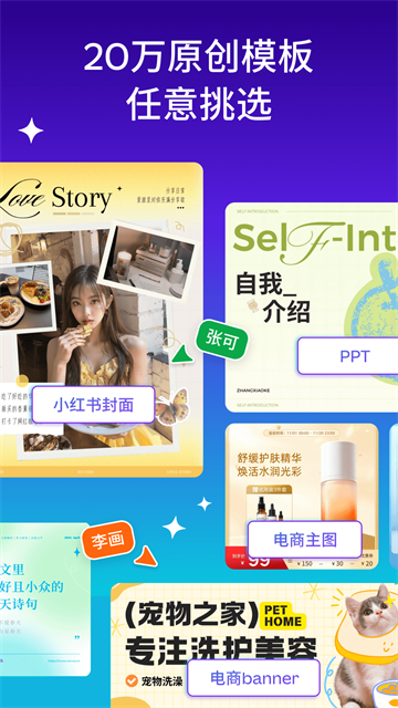 根据您的需求,您可以创建一个空白画布,或者从我们提供的10万款原创设计模板中挑选您喜欢的样式直接使用;