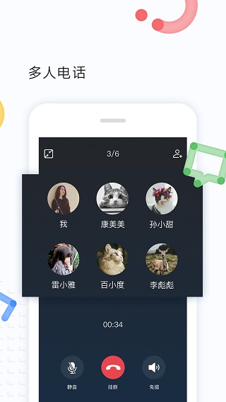 5.免费网络电话,使用完全自主研发的高清语音通话技术,支持多达100人同时通话。