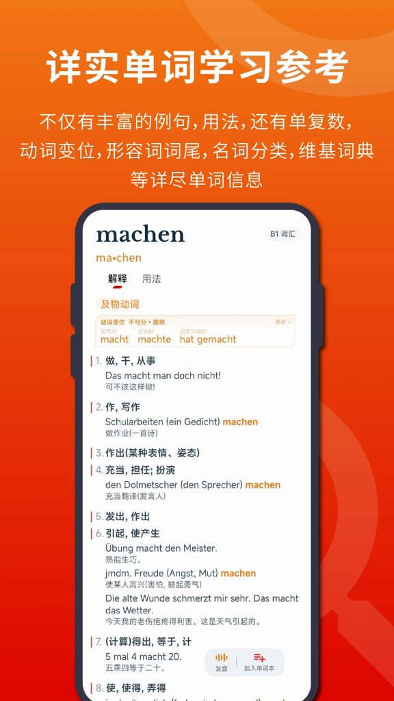 4、德语和汉语词条、德语例句均配优质清晰发音,让你德语脱口而出。