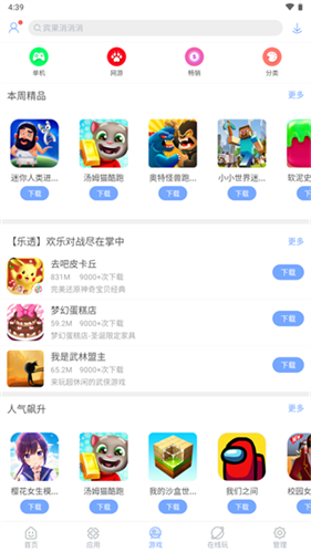 类别:将游戏按照网络游戏、中文游戏、创意休闲、动作设计、益智棋牌、角色扮演、体育竞速、模拟游戏、策略经营、竞技飞行八项类别进行大类,涵盖所有开发者上传的游戏,让用户可以轻松找到自己喜爱的游戏类型。