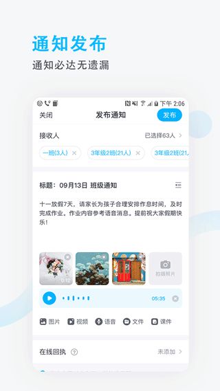 3、通知和学习任务:一键发布班级通知和学习任务,实时查看家长接收反馈,爱学班班教师端还有免费短信提醒查看;