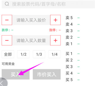 2、在交易界面中找到买入选项,并点击进入;输入需要购买的股票代码,股价以及数量,并点击下方的买入;